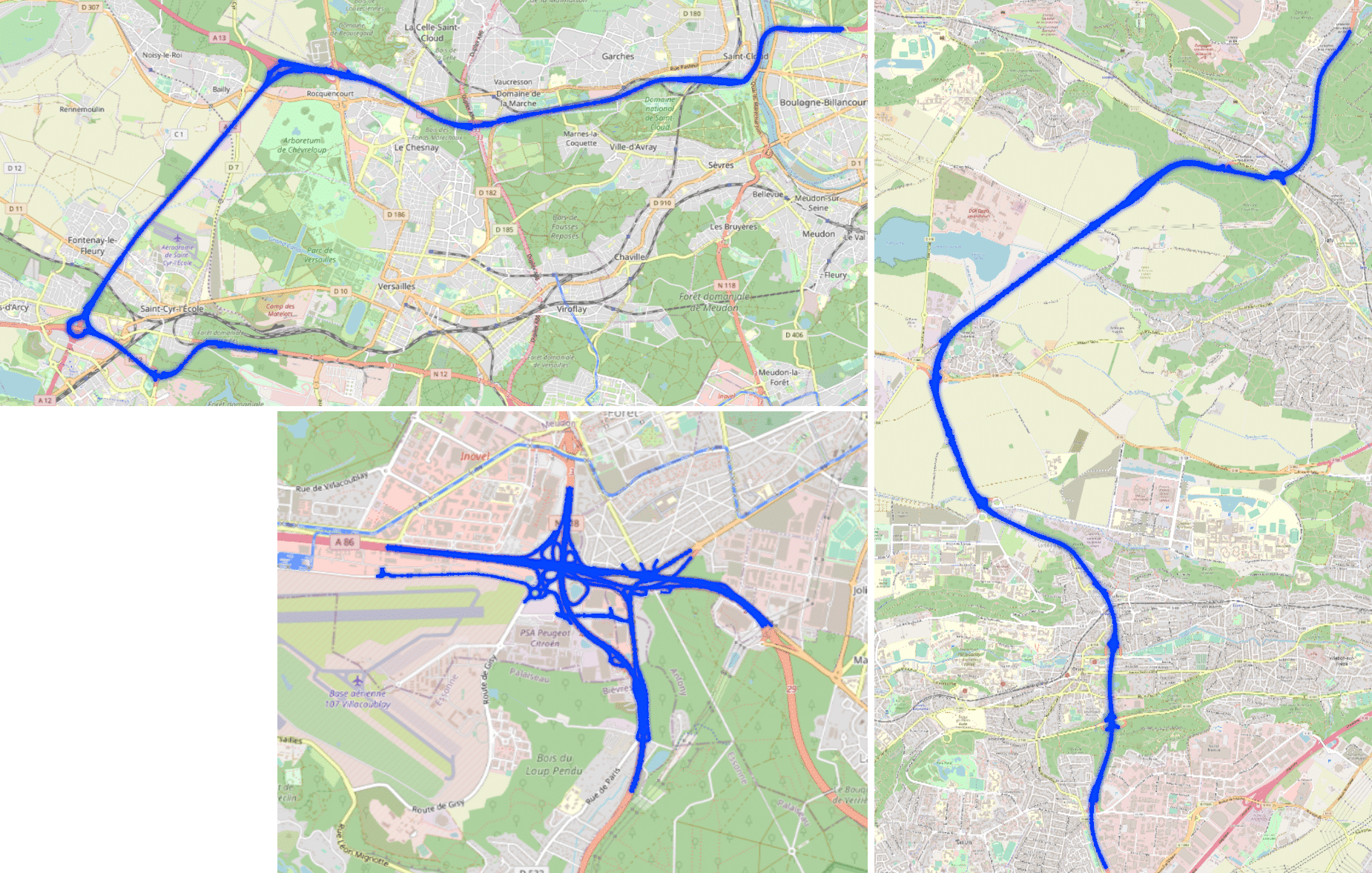 Ce réseau routier est un ensemble de trois portions routières représentatives de la réalité, comprenant les éléments de type surface de route, défauts de la route, signalisation horizontale et verticale, environnements directs. Il est utilisé par nos clients pour simuler des conduites de jour et de nuit en simulateur de diverses natures :