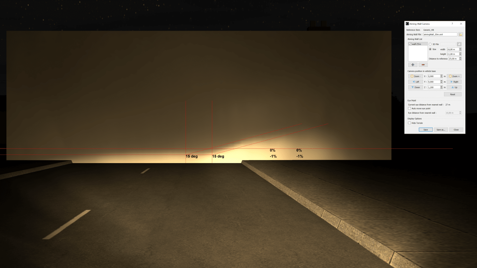 Once the headlight configuration and experimentation are ready, engineers can run the simulation as if they were driving in the middle of the night. The Headlights Pack provides a set of tools in order to help the engineer with the analysis: Isolux curves, aiming walls, illuminance sensors, etc.